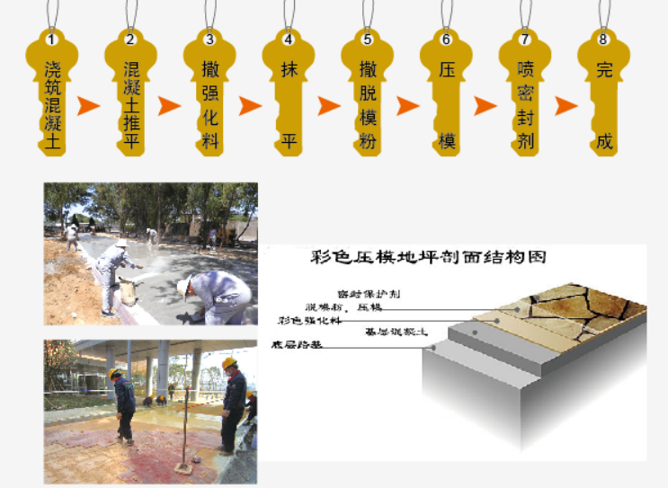浇筑混凝土——混凝土推平——撒强化料——抹平——撒脱模粉——压模——喷密封剂——完成