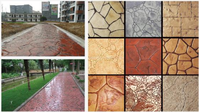 丰富多彩:由于彩色和模具的可调可选择性及表面处理技术,彩色艺术压模地坪具有丰富的色彩及图案供设计师选择,贴近自然,仿木、仿石、仿古等等。易于和环境相协调,从而设计出不同特色的建筑外观、居住小区以利于城市的美化。