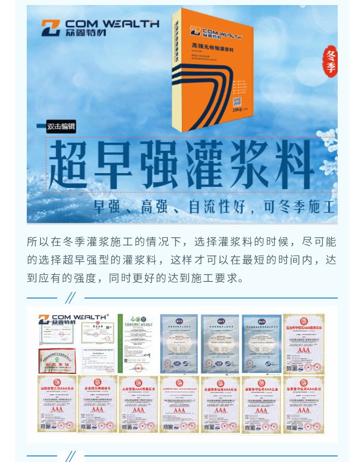 大连恒众鑫专业生产销售风电灌浆料,强度80Mpa,100Mpa,110Mpa, 120Mpa适用二次灌浆,设备基础灌浆,我们是大连灌浆料厂家,长春灌浆料厂家,有环氧砂浆,装配式套筒灌浆料,PC座浆料、高延性混凝土、UHPC、自流平砂浆等50多种产品,可满足您不同需求,有任何技术难题欢迎来电咨询:400-0411-552 众鑫特材期待您的光临!